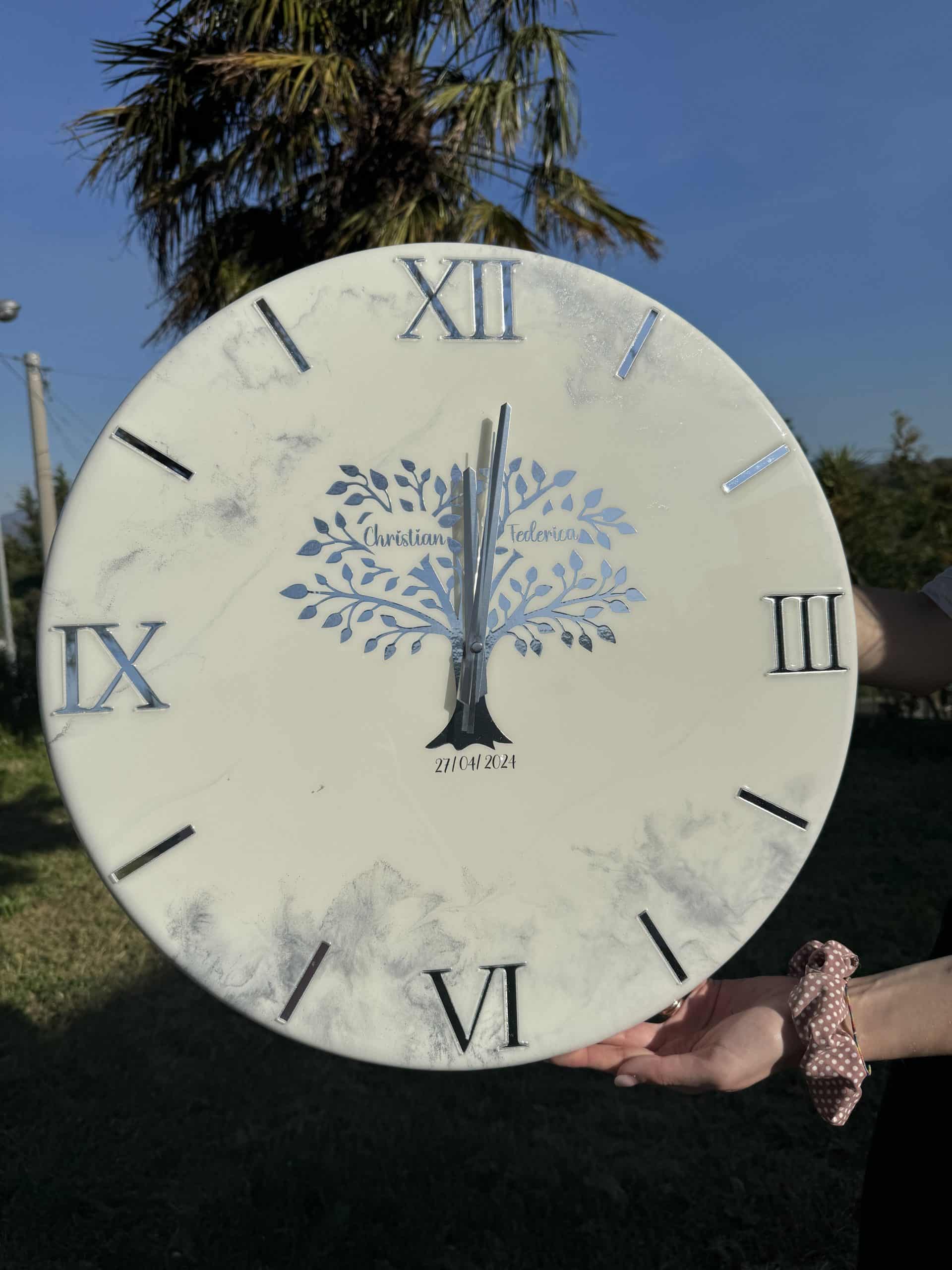 Elegante orologio da parete tondo, realizzato a mano in resina epossidica. La base bianca con al centro la stampa dell’albero della vita, i nomi della tua famiglia e la data a te cara. Perfetto come regalo di matrimonio, anniversario o semplicemente per sorprendere le persone a te care.