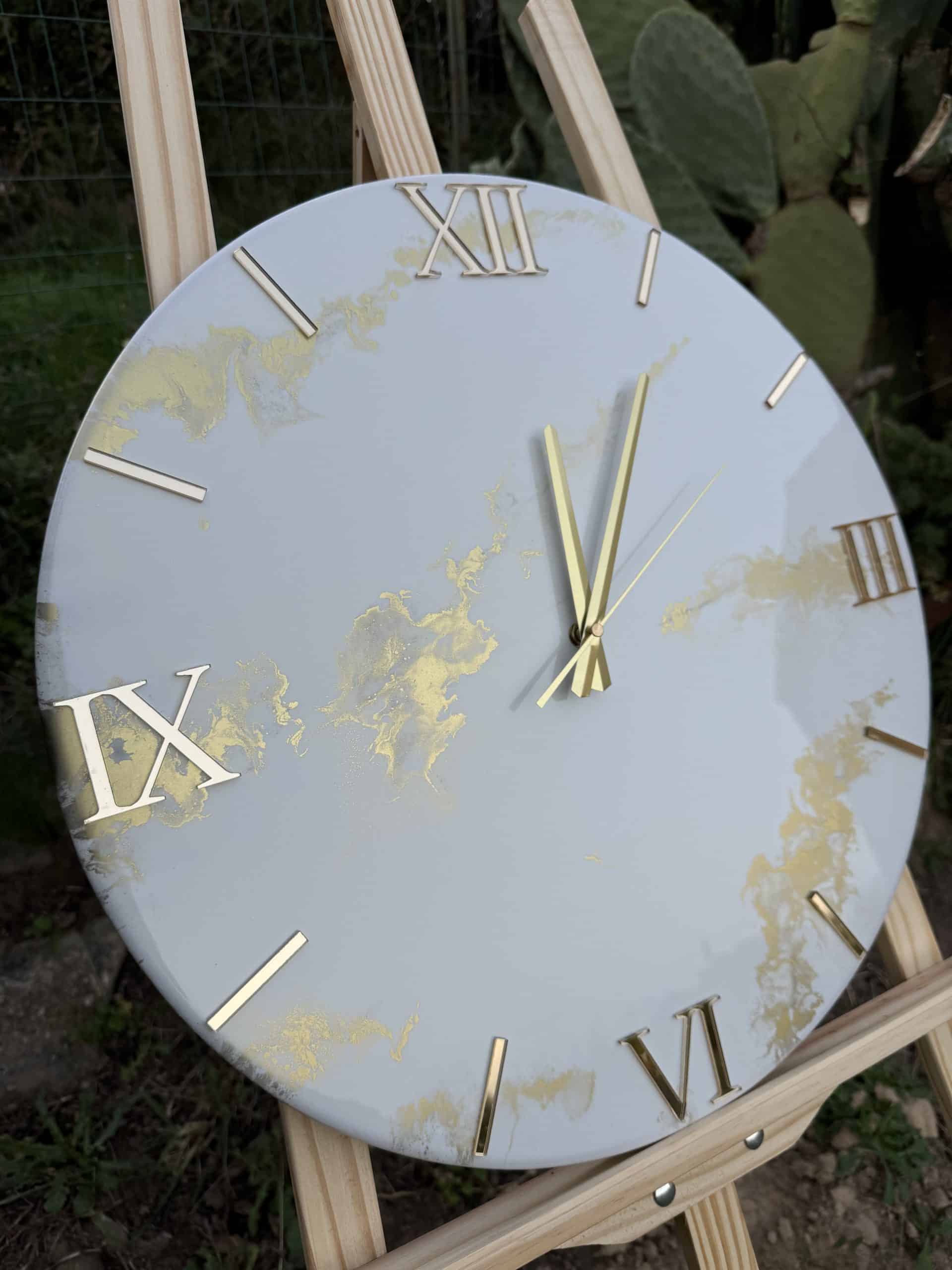 Elegante orologio da parete tondo, realizzato a mano in resina epossidica. La base bianca è impreziosita da venature delicate oro che creano un effetto moderno e sofisticato, perfetto per ambienti contemporanei e di design.