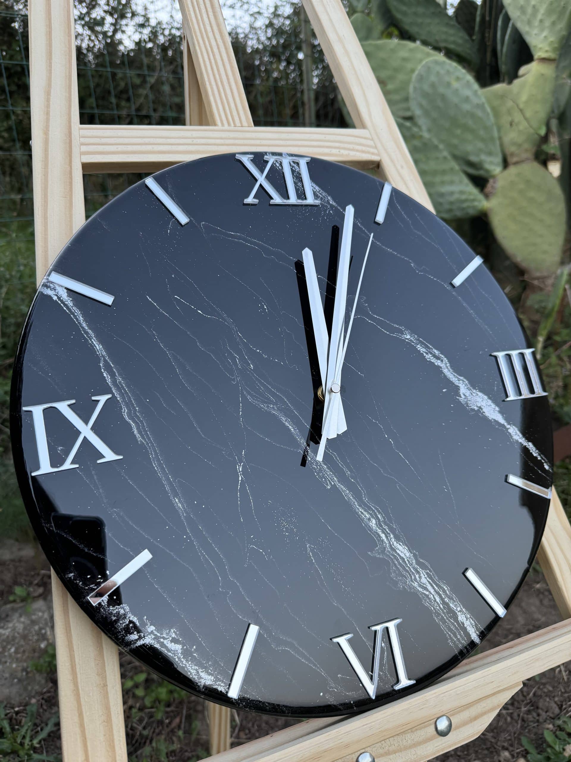 Elegante orologio da parete tondo, realizzato a mano in resina epossidica. La base nera è impreziosita da venature delicate grigio-argento che creano un effetto moderno e sofisticato, perfetto per ambienti contemporanei e di design.