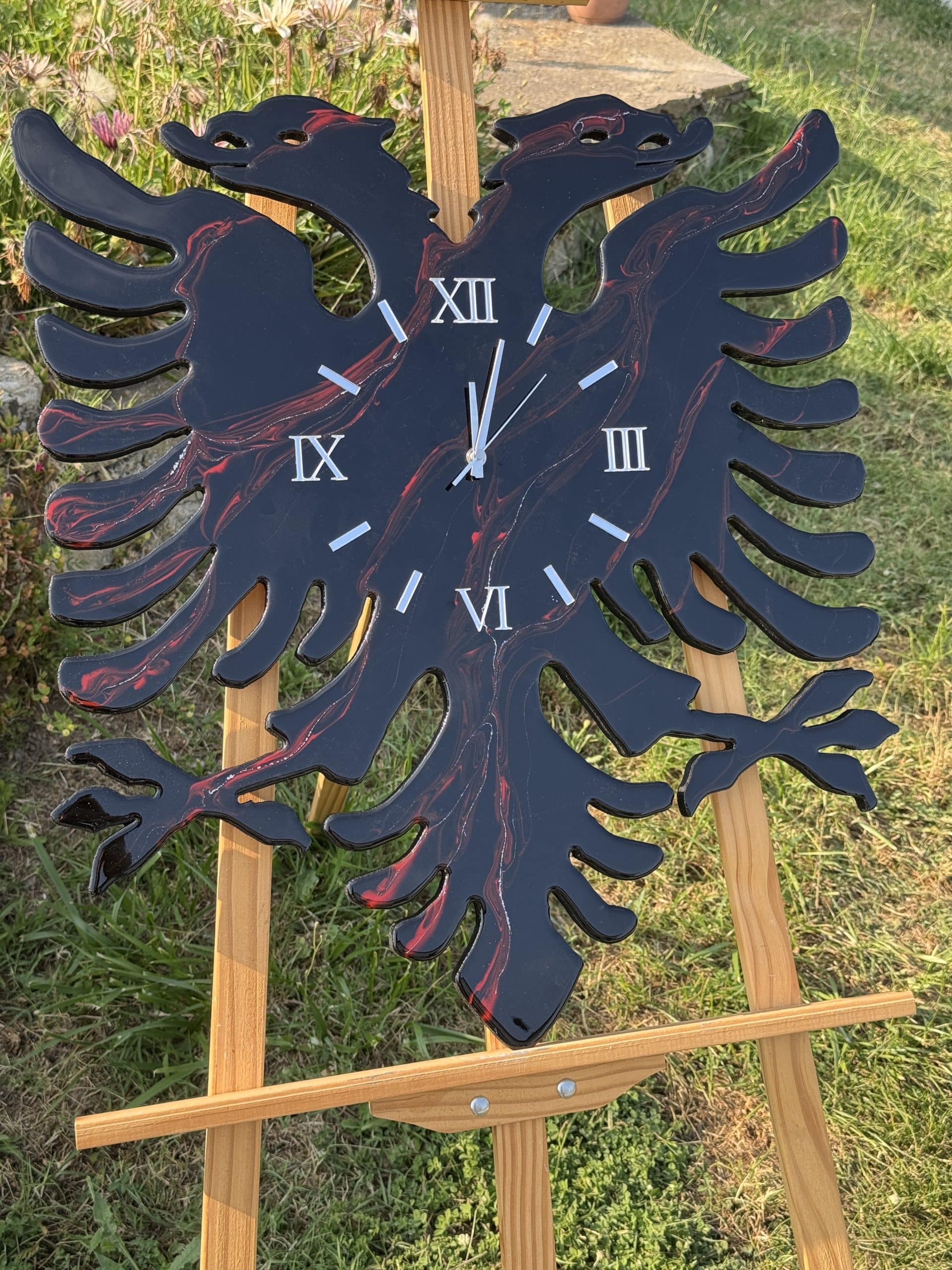 Celebra le tue radici con questo orologio da parete artigianale in resina, che raffigura l’iconica aquila bicefala dello stemma albanese, realizzata a mano con maestria e passione. I colori rosso intenso e nero profondo richiamano fedelmente la bandiera dell’Albania, rendendo ogni pezzo un potente simbolo di appartenenza e fierezza nazionale.