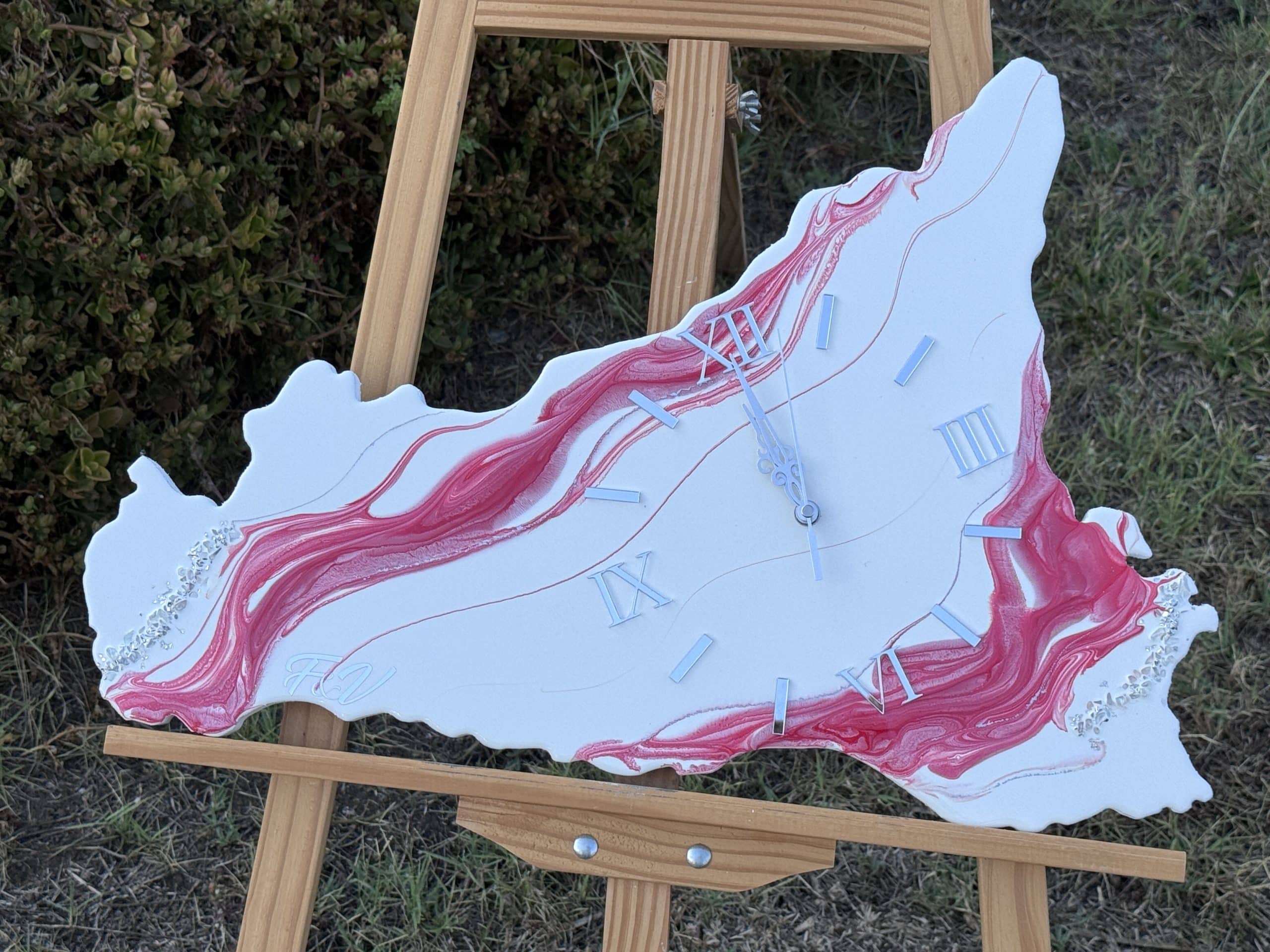 Elegante orologio da parete a forma di Sicilia, realizzato a mano in resina epossidica, la base bianca arricchita da sfumature colorate che donano un effetto marmorizzato sofisticato. I numeri ben visibili e in rilievo, completano il design con un tocco di classe.