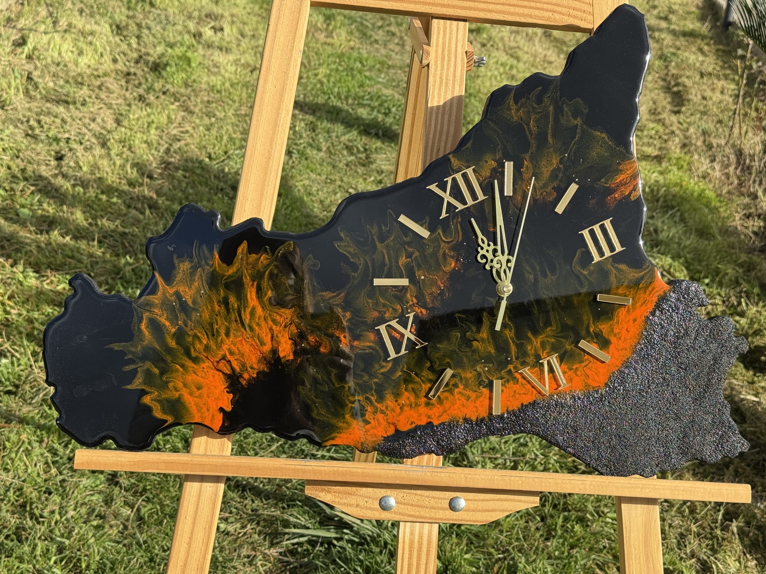 Orologio da parete a forma di Sicilia in resina epossidica realizzato interamente a mano con materiali di alta qualità. Arricchito con vera sabbia vulcanica dell’Etna, per un tocco autentico e simbolico. Il contrasto cromatico tra il nero profondo della sabbia e le vibranti sfumature arancioni richiama l’energia e il calore dell’isola, evocando le eruzioni e i tramonti infuocati siciliani.