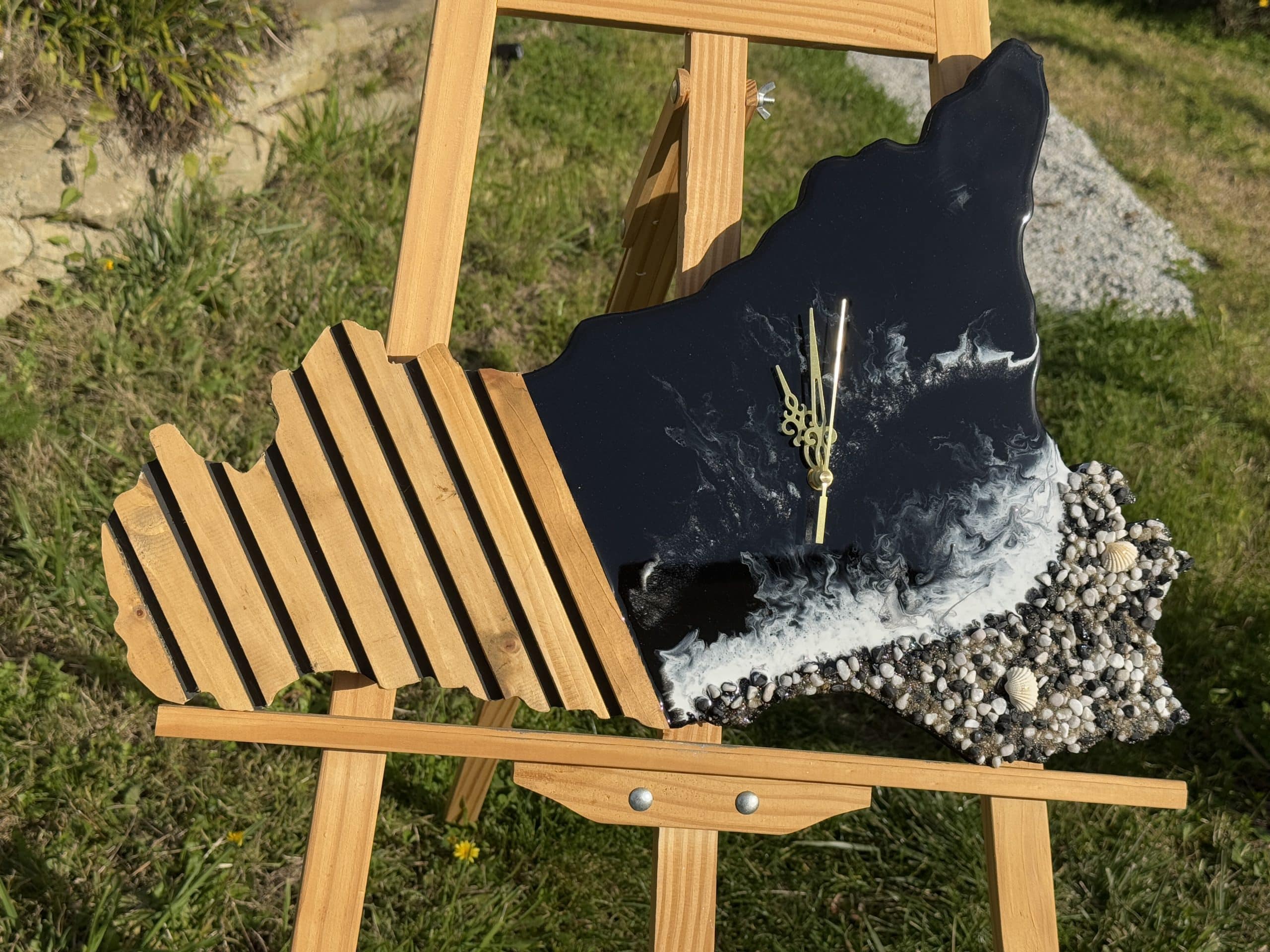 Elegante orologio da parete a forma di Sicilia, realizzato a mano in resina epossidica. Caratteristica principale è la doppia lavorazione legno-resina, base nera con onde bianche, sabbia in rilievo e assenza di numeri rendono l’orologio un pezzo unico e sofisticato.