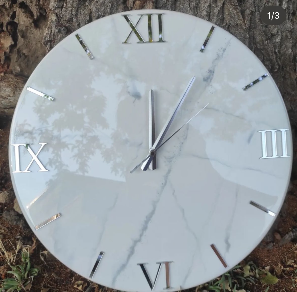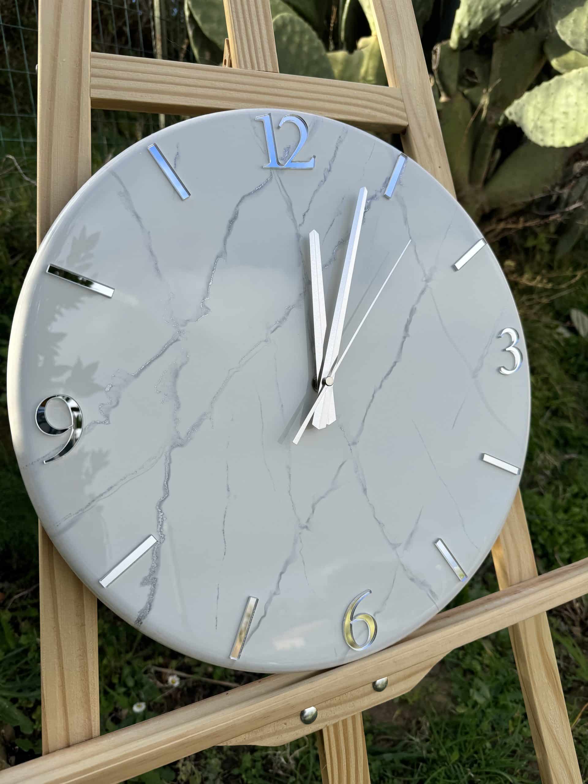 Elegante orologio da parete tondo, realizzato a mano in resina epossidica. La base bianca è impreziosita da venature delicate grigio-argento che creano un effetto moderno e sofisticato, perfetto per ambienti contemporanei e di design.