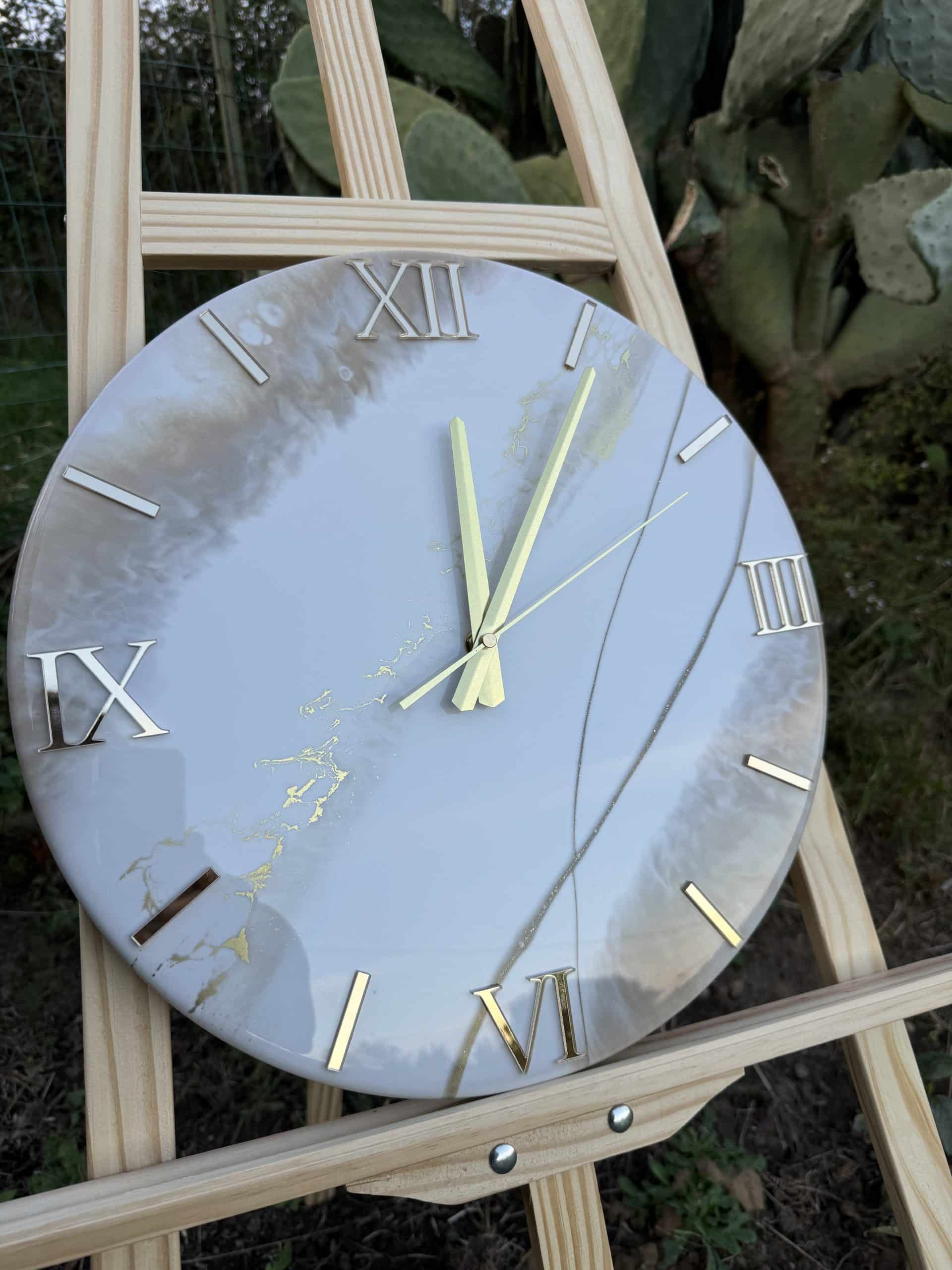 Elegante orologio da parete tondo, realizzato a mano in resina epossidica. La base bianca caratterizzata da due sfumature in beige caldo e venature oro doneranno al tuo ambiente un tocco di classe sofisticato e ricercato, perfetto per ambienti contemporanei e di design.