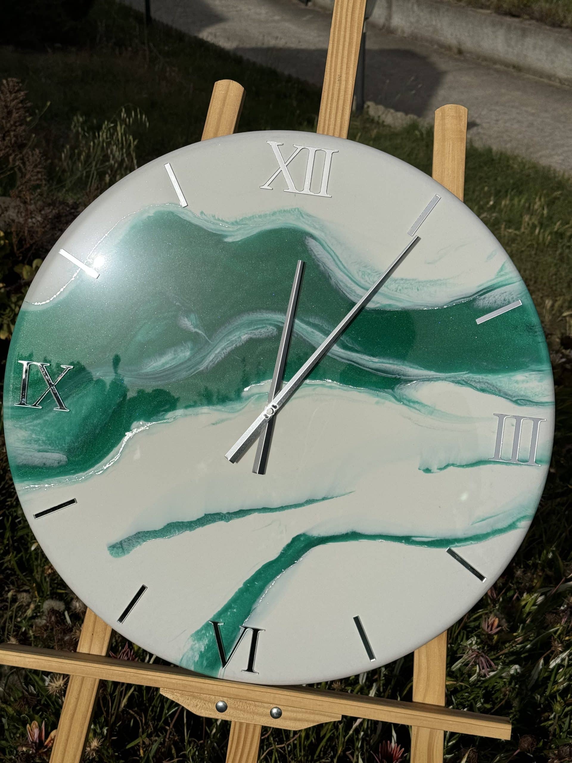 Elegante orologio da parete tondo, realizzato a mano in resina epossidica. La base bianca è impreziosita da sfumature di colore decise e che creano un effetto moderno.