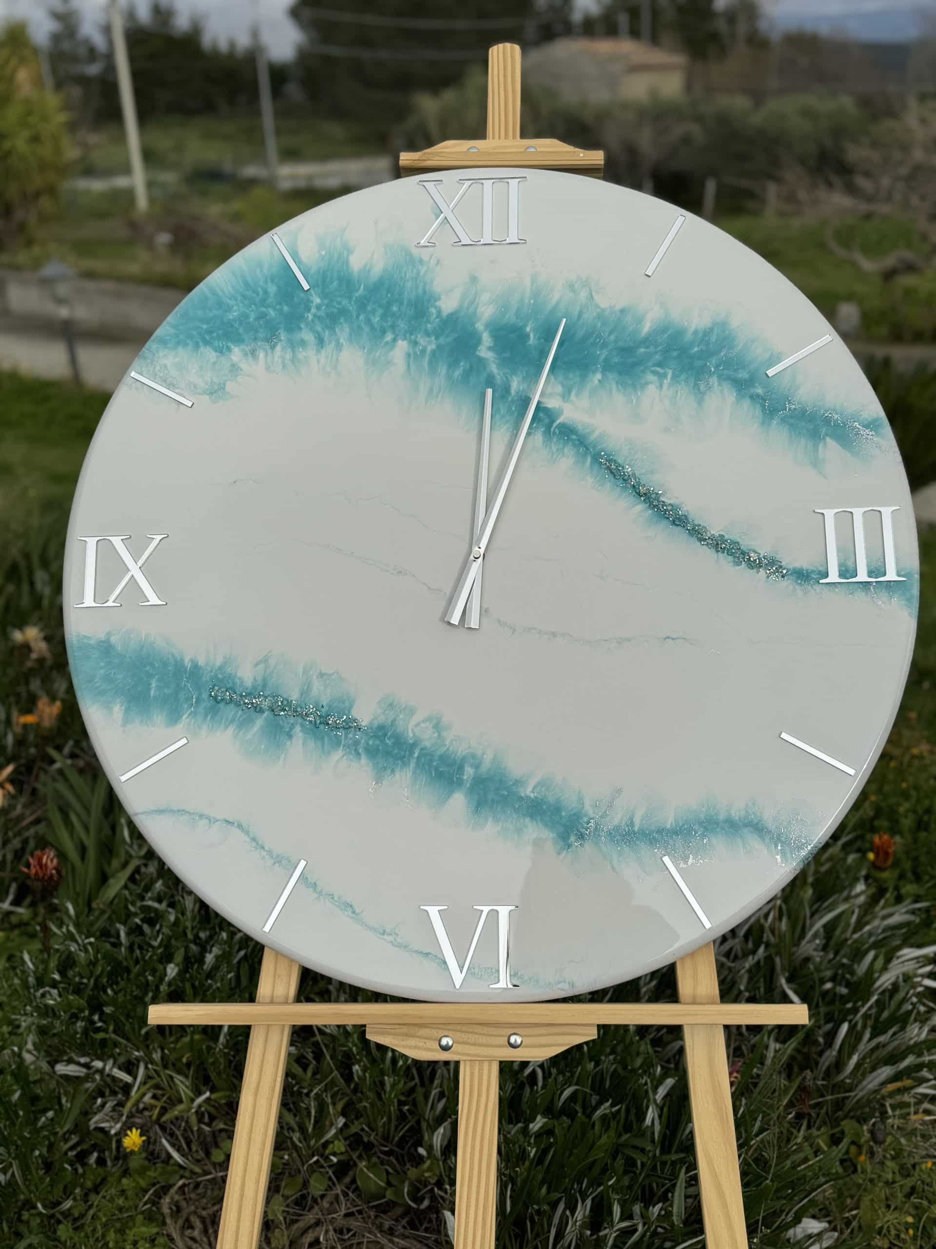 Elegante orologio da parete tondo, realizzato a mano in resina epossidica. La base bianca è impreziosita da sfumature delicate ma decise e che creano un effetto moderno e sofisticato, l’aggiunta di pietre e frammenti di vetro rendono la creazione elegante e luminosa. Perfetto per ambienti contemporanei e di design.